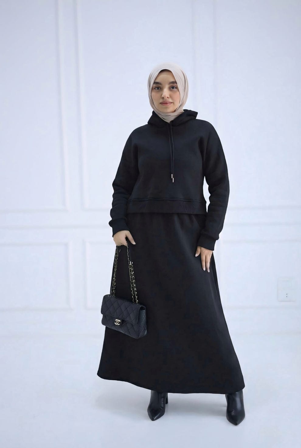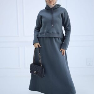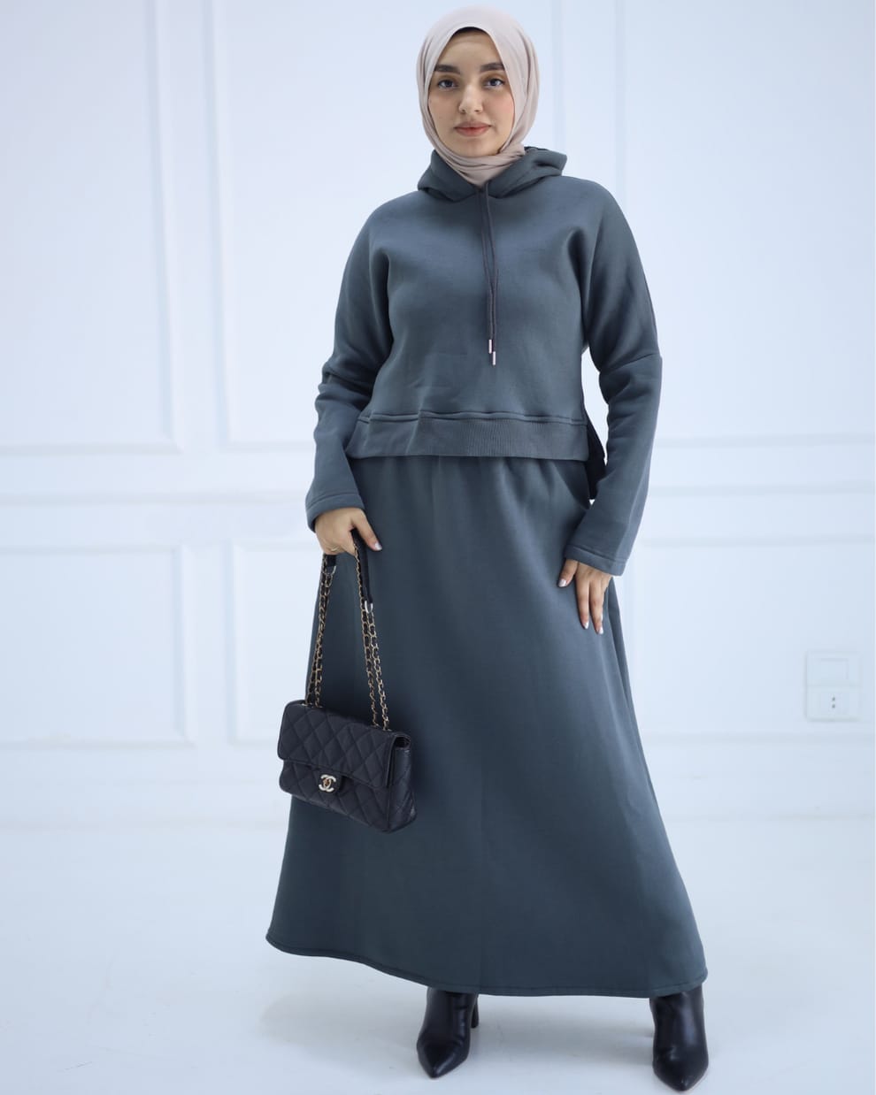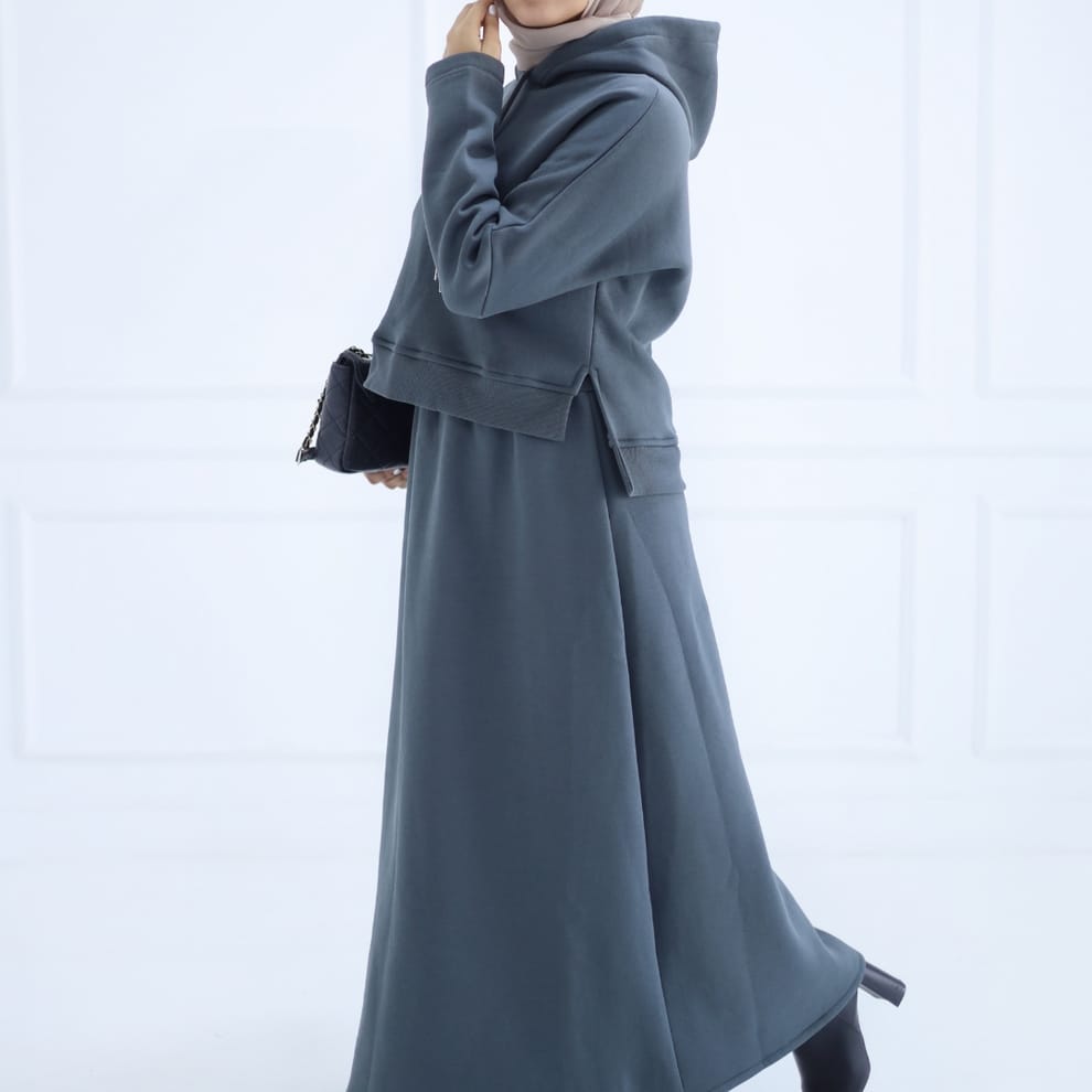 مكوّن من هودي قصير بقصّة واسعة مع تنورة طويلة انسيابية .