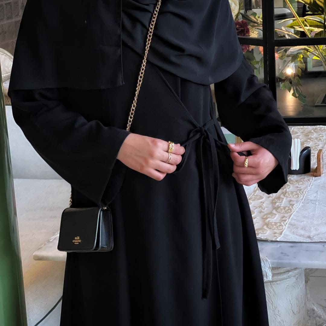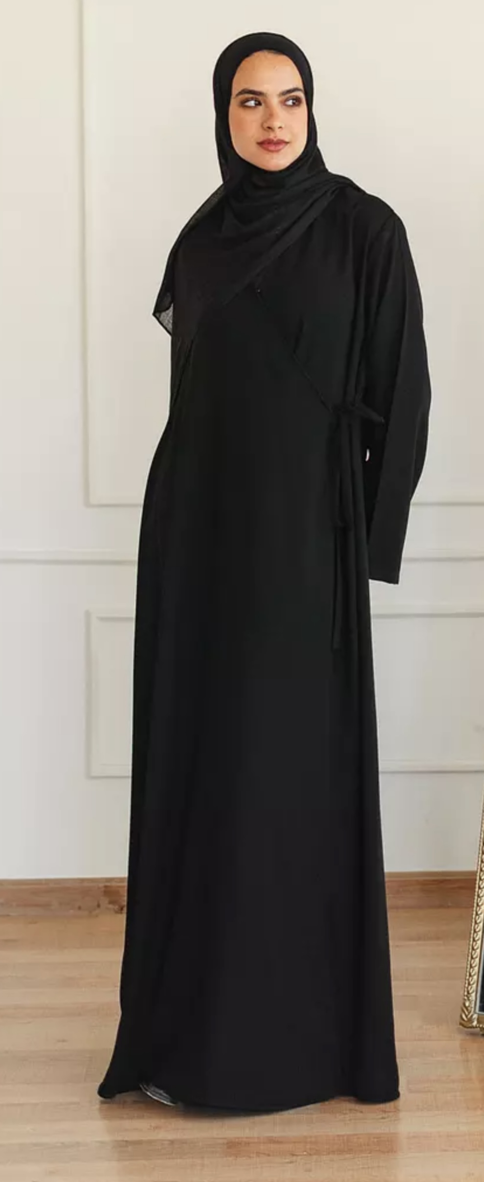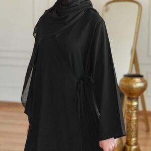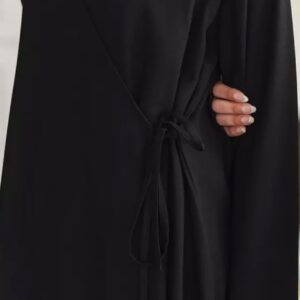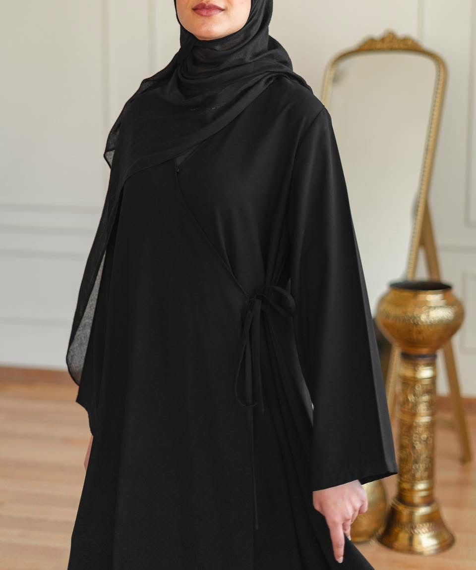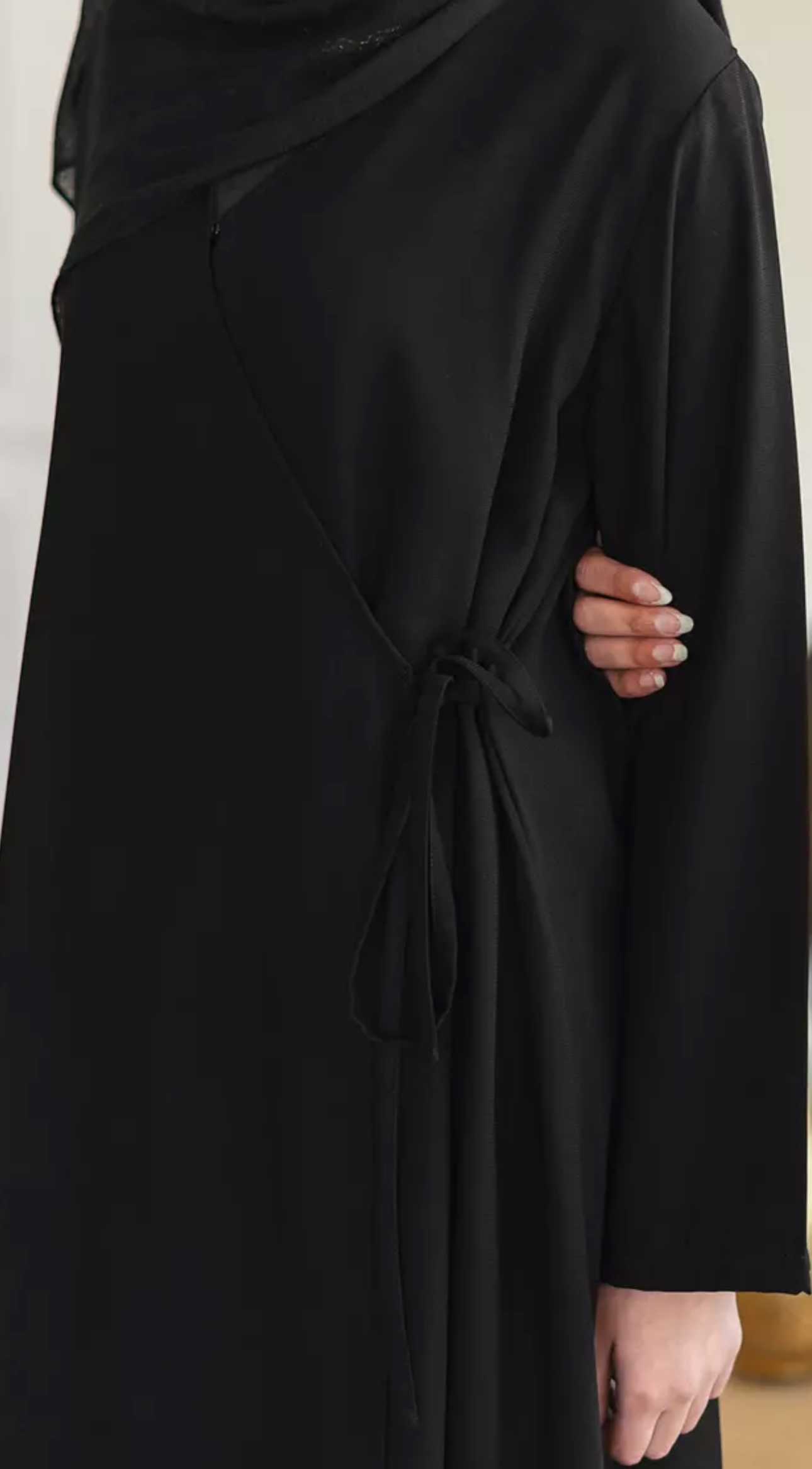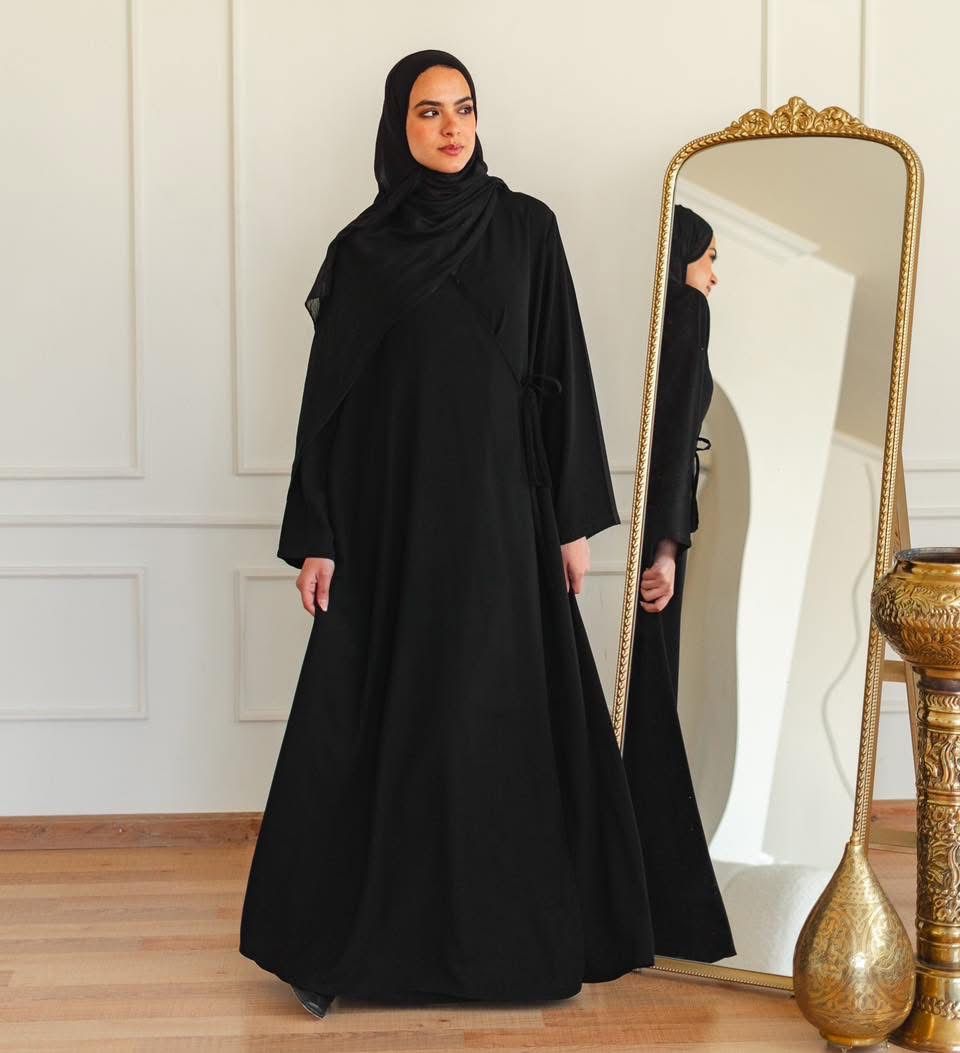 عباية ناعمة بتصميم ملفوف من الأمام بفيونكة جانبية تضيف لمسة أنثوية راقية ليمكنكِ تعديل مقاسها بكل سهولة.