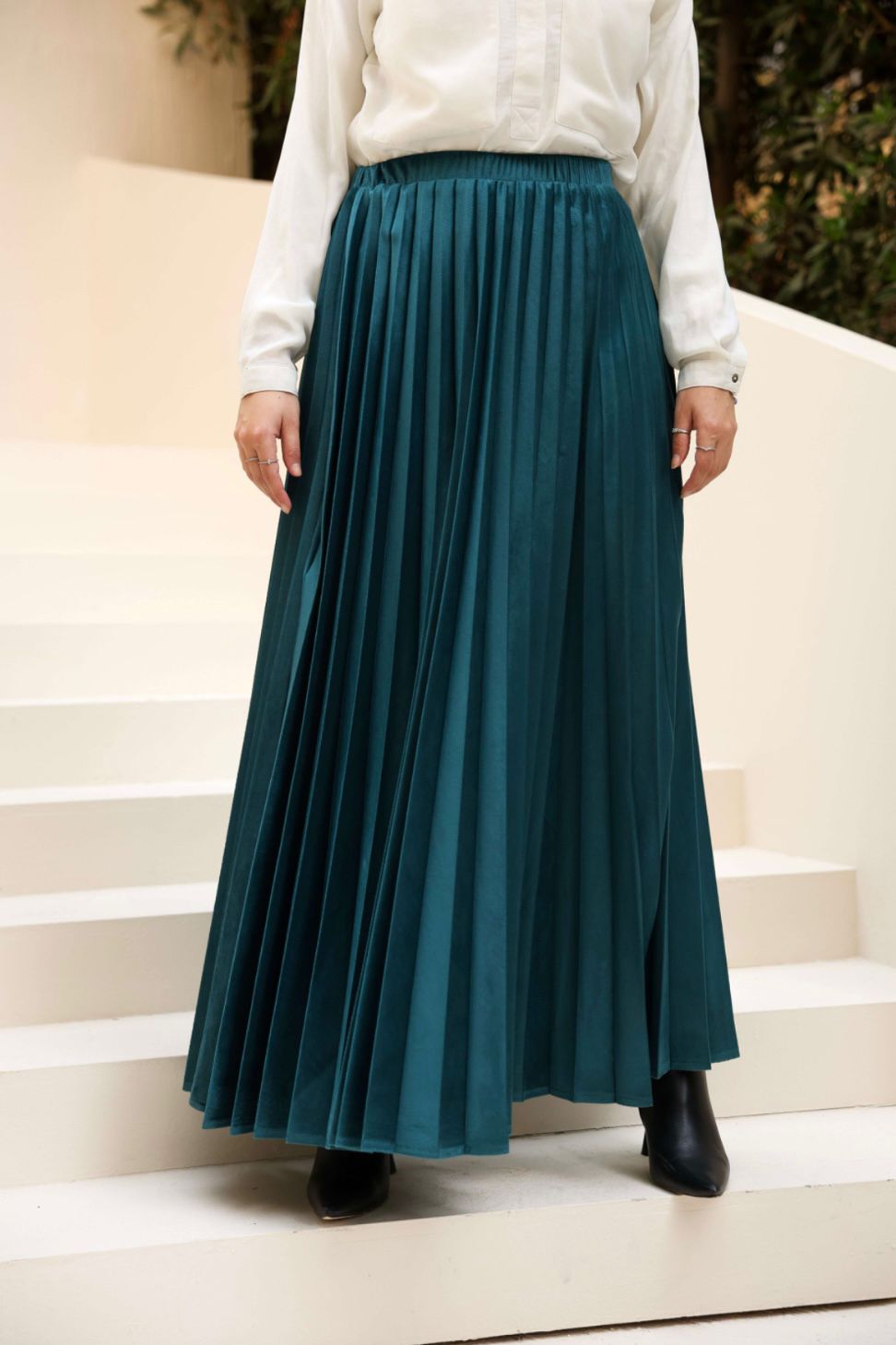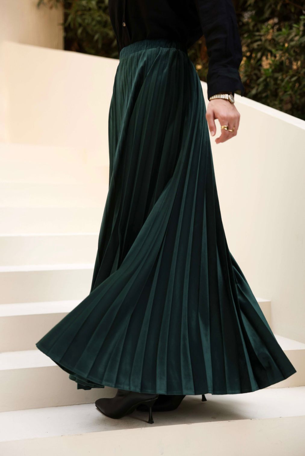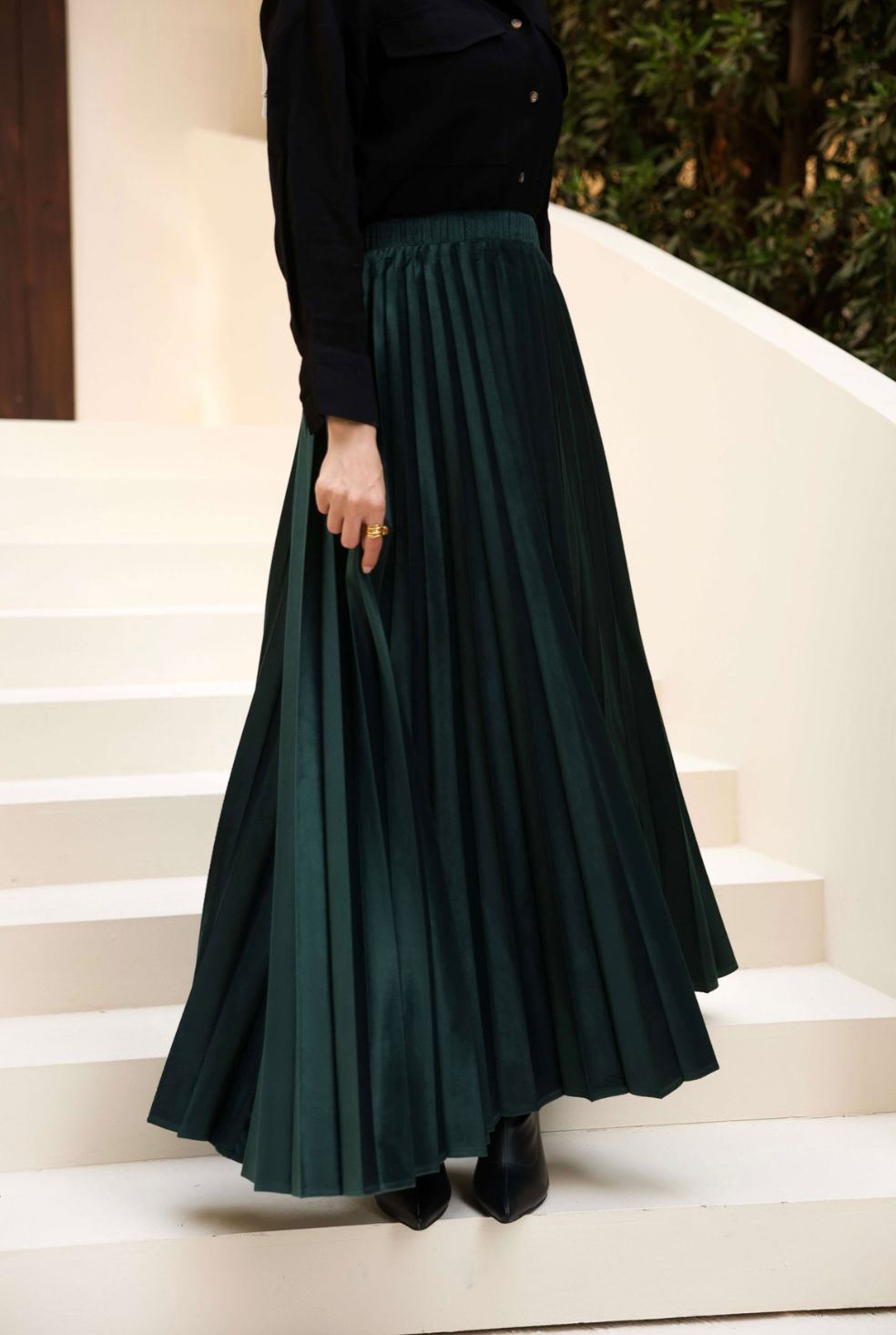 تنورة انيقة ذات تنيات من قماش قطيفة ناعم،