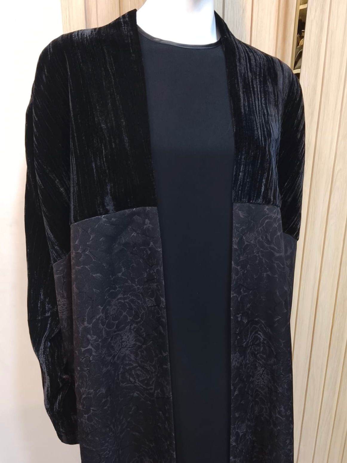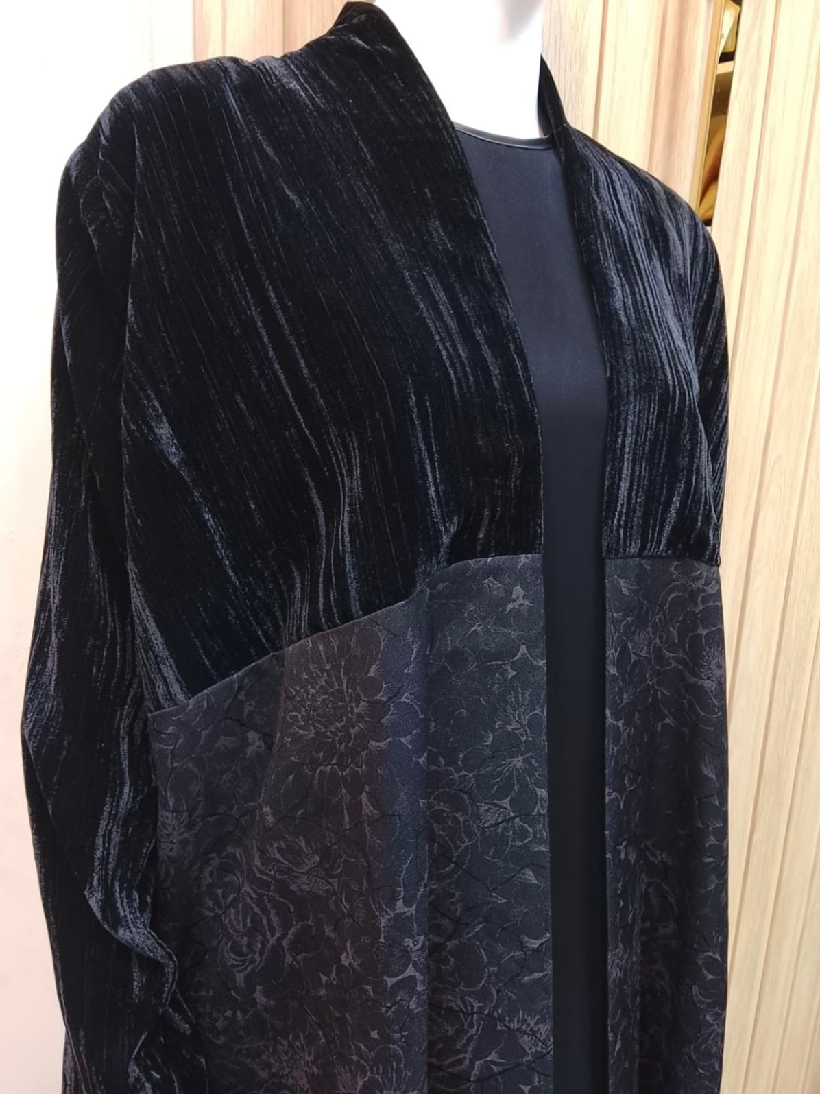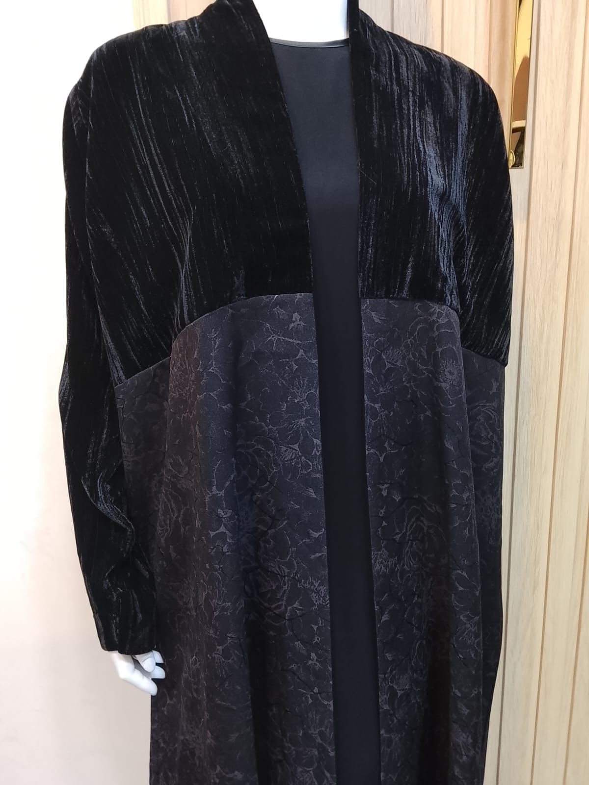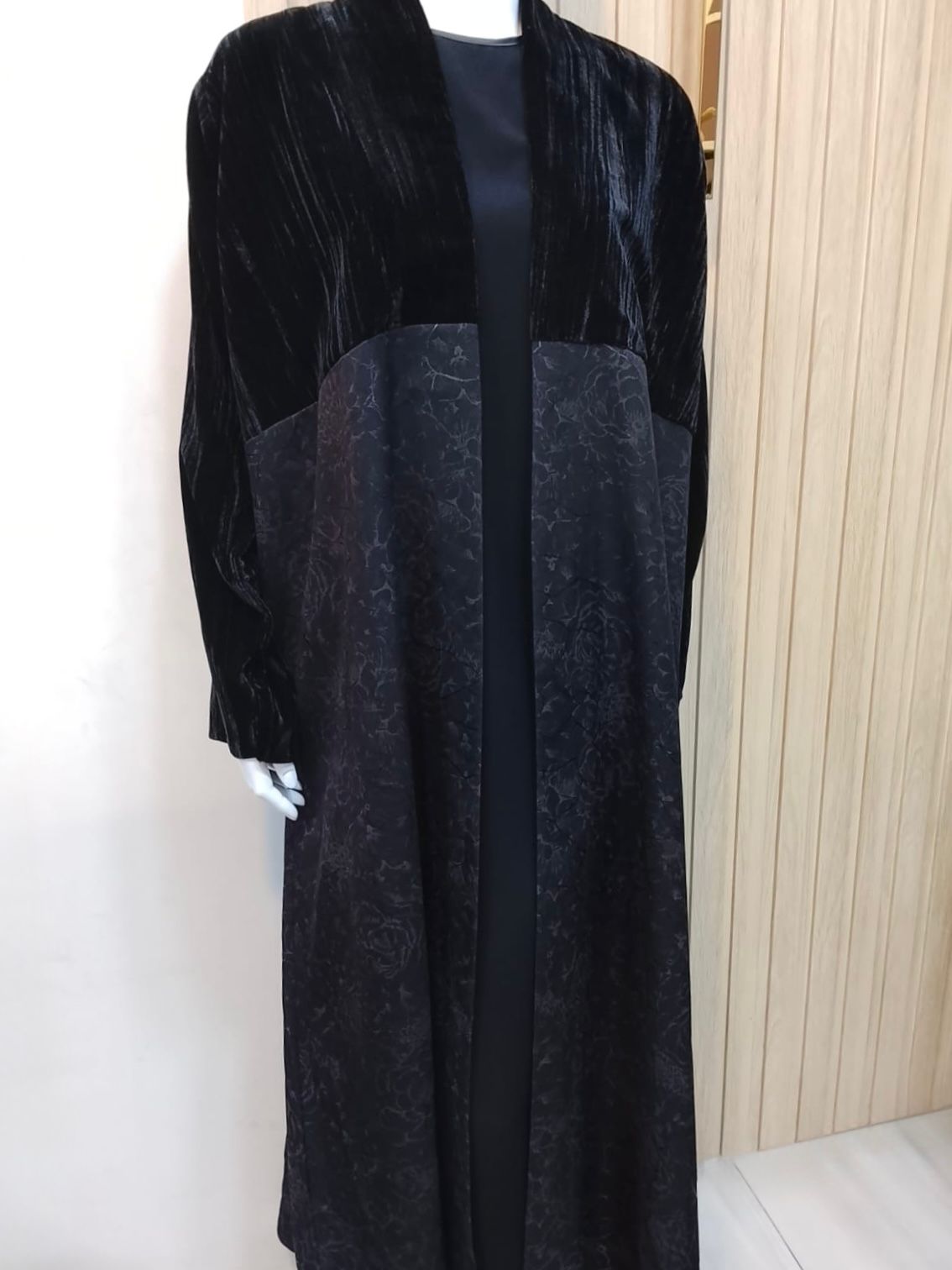 الجزء العلوي من قماش مخملي خفيف بملمس أنيق، بينما يأتي الجزء السفلي بتفاصيل نقشة ورود داكنة تضيف عمقًا وجاذبية للتصميم دون مبالغة.