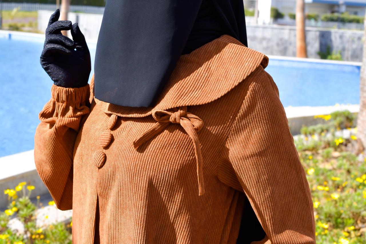 أزرار قماشية مغطاة بتصميم دائري على الصدر تعزز الطابع الكلاسيكي الأنيق.